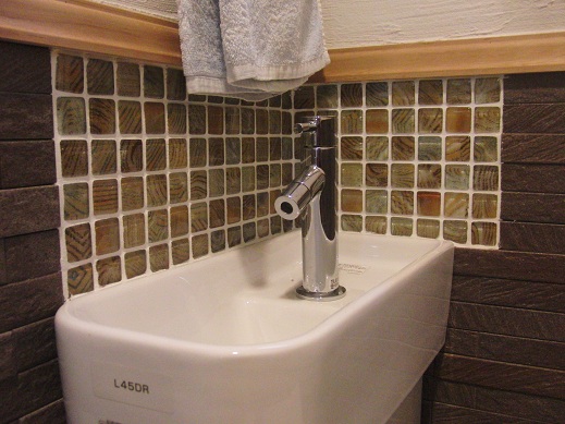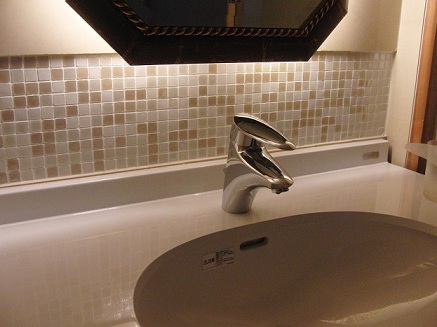 水はね防止のプラスチックパネル設置面をガラス製のモザイクタイルへ変更しました。